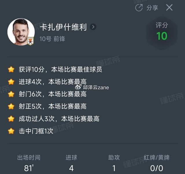 第一个,卡扎伊什维利本轮联赛贡献了4球1助攻,这是什么概念,之前的中超最佳球员,很多都是进2个球,或者1球1助攻就可以,卡扎伊什维利这完全是降维打击,另外,他这场比赛更是6项数据高居第一,除了进球之外,还有3次成功过人和1次击中门框,获评全场最高的10分满分。