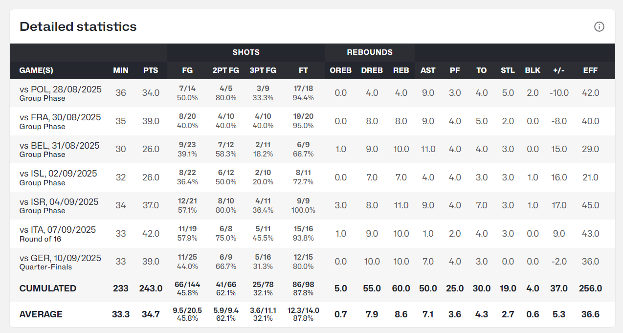 东契奇本次欧洲杯场均33.3分钟,拿到34.7分8.6篮板7.1助攻2.7抢断0.6盖帽,命中率45.8%,三分命中率32.1%,得分、助攻、篮板、抢断、盖帽、效率都是斯洛文尼亚第一,其中得分、效率是欧洲杯第一。