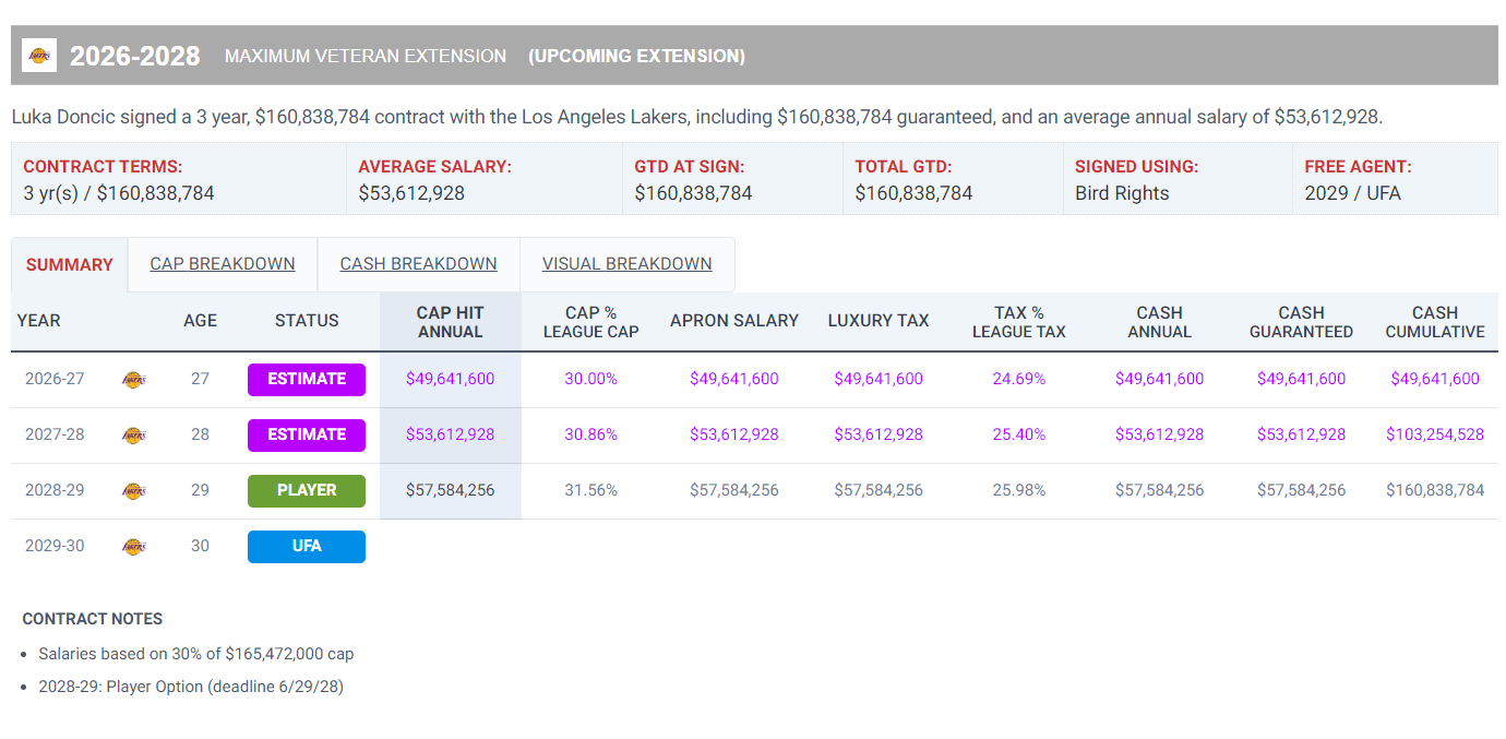 在东契奇欧洲杯出局后,洛杉矶湖人队必然成为最大的赢家,东契奇今夏与湖人签下三年1.65亿的提前续约顶薪,而这1.65亿只有1.608亿是全额保障,因为1.65亿是基于递增的工资帽 ,如果工资帽没有逐年递增那么这份顶薪最终就是三年1.608亿。如此超巨长留湖人,还不是塔图姆、布朗那种动则6000-7000万的均薪,何尝不是一种大胜?